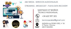 * DCP (Cine Digital) FHD - 2K - 4K * DIGITALIZACIÓN VIDEO y CINE 8mm, SUPER 8, 16mm & 35mm / AUDIO * Subtitulado / Traducción & Audiodescripción para sordos según normas UNE * Grabación con Drones / Pilotos titulados & Registrados AESA * PostProducción de Vídeo. * Grabación y realización de eventos * Streaming - Transmisiones en vivo * Almacenamiento y recuperación de datos